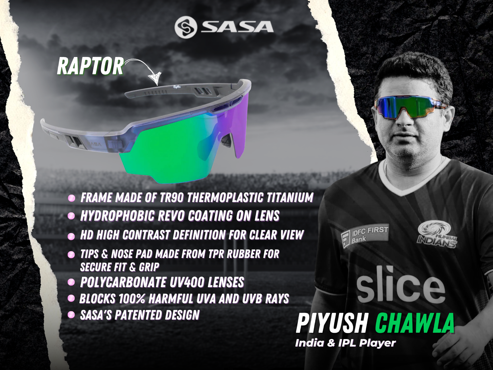 Piyush Chawla wearing SASA Raptor Sunglasses! Piyush Chawla is an Indian cricketer who has played for the India national cricket team. He was a member of the Indian team that won both the 2007 T20 World Cup and the 2011 Cricket World Cup. He is seen as a leg-spinning all-rounder in domestic cricket.