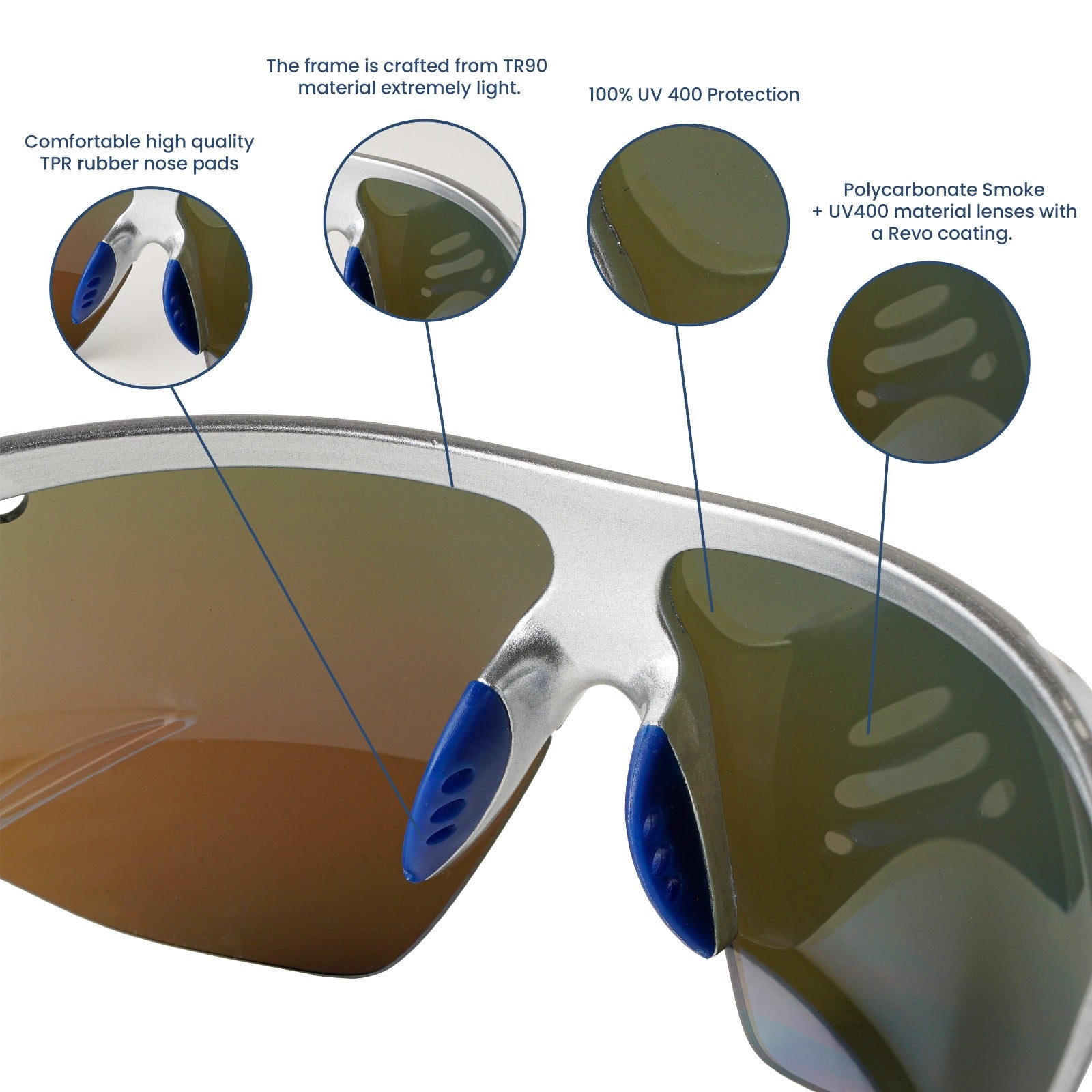 Lens are Polycarbonate UV400 material with Revo coating which blocks 100% harmful UVA and UBA Rays. HD ( High Contrast definition) to enhance, restore true colour, eliminate reflected light.
